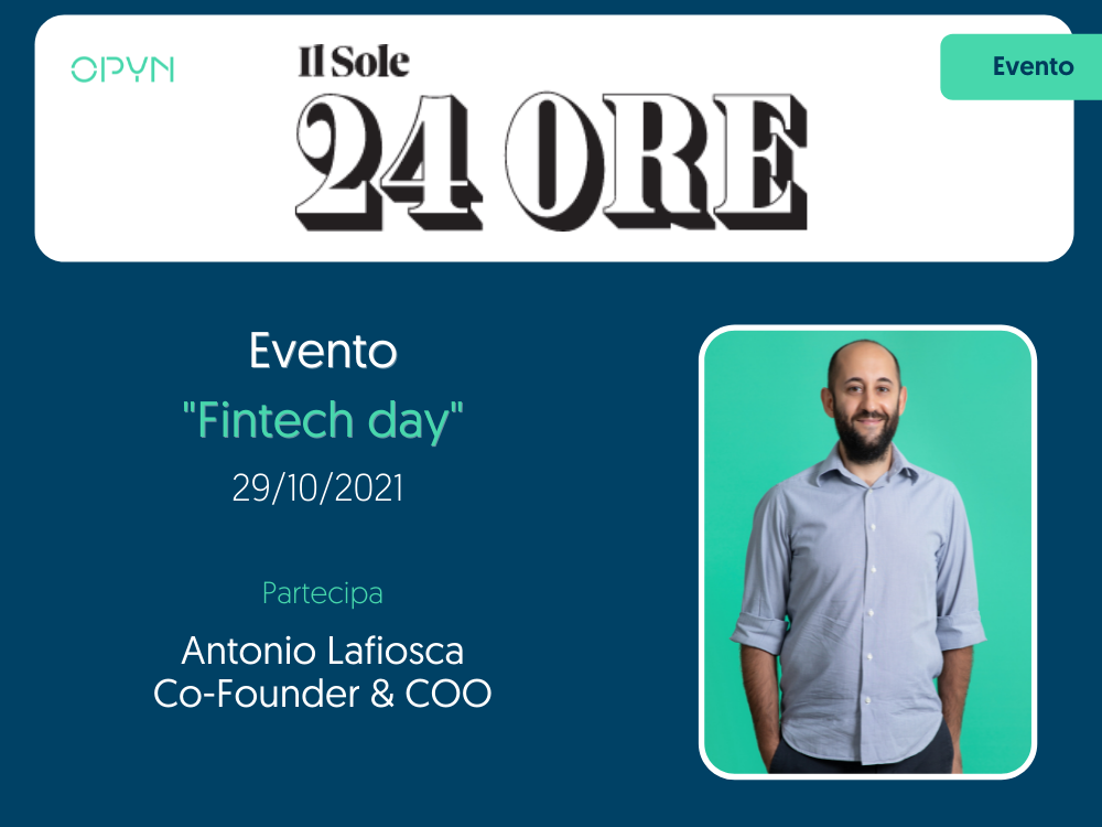 Antonio Lafiosca, Co-Founder e COO di Opyn, parteciperà al Fintech Day del Sole 24 Ore, intervenendo alla tavola rotonda sul sistema dei pagamenti e le nuove opportunità di finanziamento.