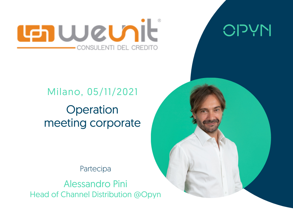 Alessandro Pini, Head of Channel Distribution di Opyn, parteciperà alla convention Operation Meeting Corporate organizzata da WeUnit, che si terrà in presenza al Novotel Milano Nord Ca Granda, il 5 novembre dalle ore 9.30 alle ore 10.30.